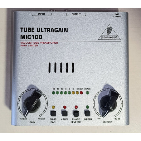 Behringer Tube Ultragain MIC200, préamplificateur micro et instrument à lampe. Idéal pour réchauffer et améliorer le signal en home studio, podcast ou petite régie. Entrées XLR et jack 6,35 mm, sorties XLR + jack. Occasion, fonctionnement normal. 👉 30 €
